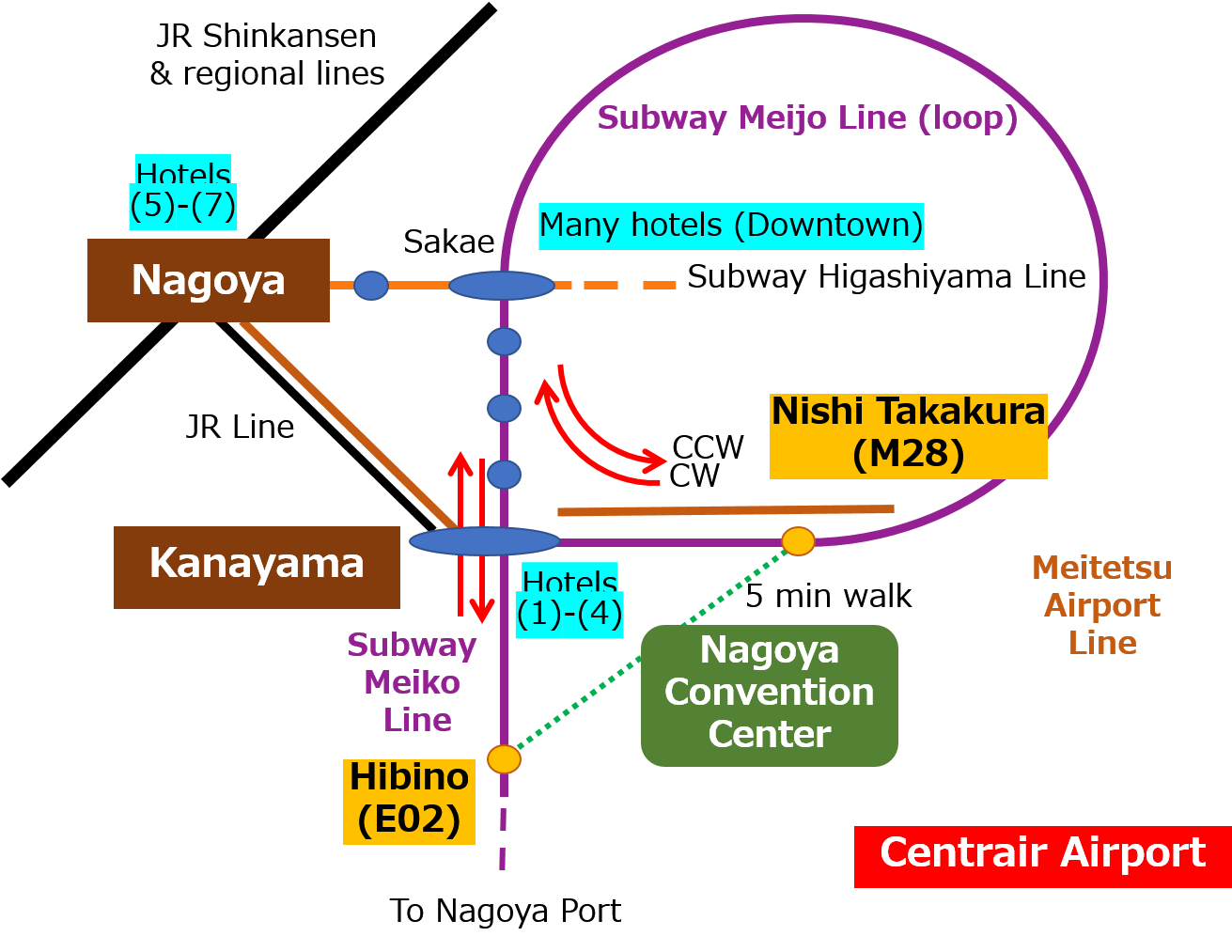The conference hotels are located near Kanayama (hotels (1)-(4)) and Nagoya stations (hotels (5)-(7)). One can also find many hotels around the Sakae station (downtown area).